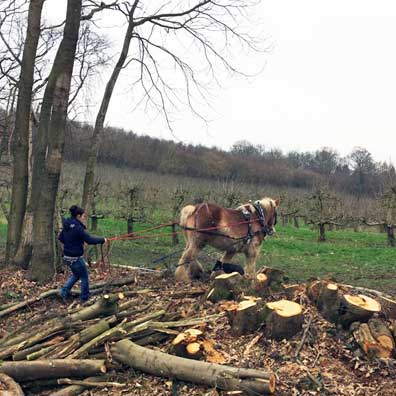 The woodland at Rooks Hill Farm is on a steep bank, which means that mechanical means of timber retrieval are not easy. Instead, we use horses to move the timber from the site. This also has the advantage of being a more environmentally friendly method as horses do not compact the soil the way heavy machinery does.